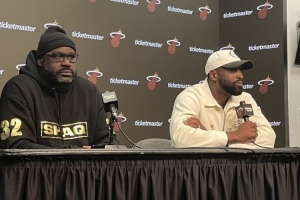 发布会期间奥尼尔吹牛说自己对现在这支热火很熟悉,韦德则调侃让他说出5个球员的名字,奥尼尔沉默了...