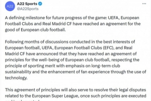体育资讯2月13日讯 欧超公司A22社媒发表声明,确认欧足联、皇马、欧洲俱乐部协会达成原则协议,正式终结持续5年的欧超联赛项目及相关法律纠纷