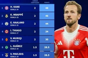 本赛季目前欧洲金靴奖积分榜:凯恩居首,姆巴佩次席、哈兰德第三