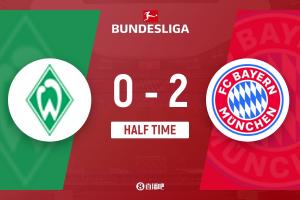 半场-凯恩点射+精妙远射破门卡尔造点迪亚斯失良机 拜仁2-0不莱梅