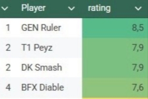 体育资讯2月22日讯 外网LCK AD评分:Ruler第一,Peyz和Smash第二。
