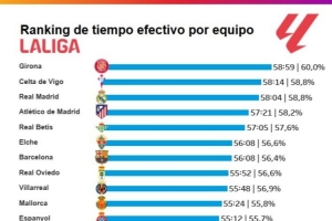 体育资讯3月3日讯 Opta统计了本赛季西甲各队联赛场均比赛净时间,并列出榜单,赫罗纳居首,皇马第三、巴萨第七。