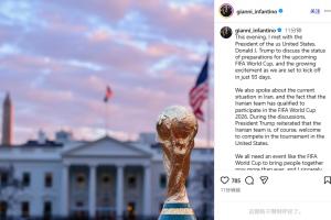 因凡蒂诺写道:“今晚,我会见了美国总统特朗普,讨论了即将举行的FIFA世界杯的筹备情况,并表达了我们对93天后世界杯即将开赛的激动心情。