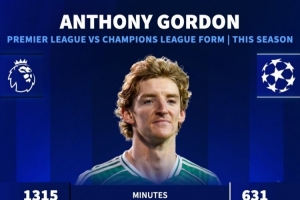 体育资讯2月19日讯 欧冠附加赛首回合比赛,戈登打进4球,纽卡客场6-1击败卡拉巴赫。德国转会市场统计了戈登本赛季英超、欧冠数据,并做出对比。
