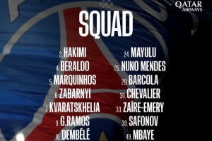 巴黎欧冠vs纽卡名单:登贝莱、阿什拉夫、若昂·内维斯在列