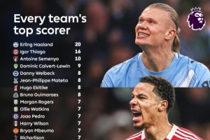 英超各队本赛季联赛射手王:曼城哈兰德20球 阿森纳2人各5球