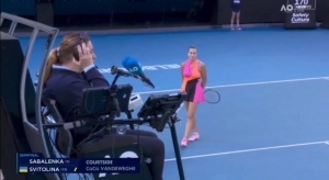第三局,主裁认为萨巴伦卡在击球过程中喊叫声干扰到了斯维托丽娜,所以把这分直接给了对手。萨巴伦卡申请视频回放挑战,但也没有成功。